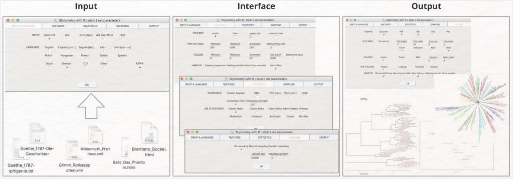 Der Stylo-Workflow: Nach dem Öffnen der grafischen Benutzeroberfläche lassen sich Textsammlungen in den Formaten TXT (empfohlen), XML oder HTML hochladen. Die einzelnen Tabs führen Sie durch die möglichen Einstellungen der stilometrischen Analyse. Heruntergeladen und spezifiziert werden die ausgewählten Visualisierungen in verschiedenen Dateiformaten wie PDF und/oder JPG.